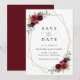 Invite friends and family in style and set the tone for your special day with this charming save the date card. Design features burgundy watercolor flowers, greenery and gold frame on white background.