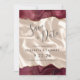 The top and bottom edges of this elegant modern wedding save the date card feature a burgundy red watercolor agate border trimmed with faux gold glitter. The customisable text combines charcoal grey handwriting and sans serif fonts on a background image of ivory silk or satin. The reverse side features a matching burgundy agate and ivory silk design.