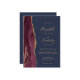 The left-hand edge of this elegant modern wedding invitation features a burgundy red watercolor agate border trimmed with faux gold glitter. The customisable text combines gold-coloured handwriting, copperplate and italic fonts on a navy blue background. The reverse side provides space for wedding details on a solid navy blue background, along with a QR code guests can scan to visit your website and RSVP, which saves the cost of printing and mailing separate RSVP cards.