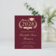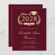 Modern budget-friendly burgundy red college graduation announcement featuring "Class of" in an illustration of a gold laurel wreath, a grad cap topper and a diploma and the graduate's name in an elegant light gold script. Add their school, major, honours or future plans.