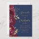 The left-hand edge of this elegant modern wedding invitation features a burgundy floral border trimmed with gold faux foil foliage. The customizable text combines gold-colored script and sans serif fonts on a navy blue background. The reverse side provides space for wedding details, along with a QR code guests can scan to visit your website and RSVP, which saves the cost of printing and mailing separate RSVP cards.