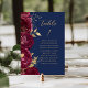 This elegant modern wedding table number card features a border of burgundy flowers and gold faux foil leaves. The word "table" appears in gold-colored handwriting script on a navy blue background. Add the names of your guests who are assigned to each table.