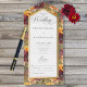 AVAILABLE WITH OR WITHOUT A QR CODE OR DINNER SELECTION OPTIONS. This design features a beautiful marsala burgundy wine and yellow gold rustic floral pattern on a green aged background. The text is displayed on a white text area insert with a faux gold frame. The back continues the floral pattern and includes the bride and groom's first initial. Created by Simply Farmhouse Press.