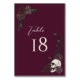 This Burgundy Gothic Wedding Table Number Card features two elegant gothic floral corner designs, with a subtly laughing skull accent in the lower corner for a refined dark romance touch. The center displays “Table” on one line with the table number below for a clean, balanced layout.