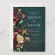 Beautiful bouquet of burgundy & cream flowers mixed with greens bordering modern fonts done in white on a deep elegant green background were used to create this modern wedding invitation. Perfect for any season wedding. Coordinating green reverse side. Absolutely stunning!