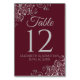 Make your wedding reception beautiful with these table number cards. They feature a simple yet elegant design with Grey text on a burgundy or maroon background with a silver faux foil floral border.