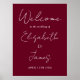 This burgundy red minimalist elegant script wedding welcome sign can be personalised with your information in chic typography. Designed by Thisisnotme©