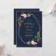 A Navy blue and burgundy Floral design with a gold geometric frame with text in the middle.