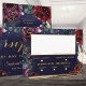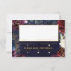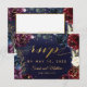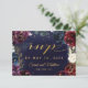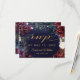 An assembly of deep burgundy red, purple and navy blue peonies adorned with shimmering gold outlines against a dark rich navy blue watercolor canvas with splotches of gold sets the tone for this lavish wedding invitation RSVP with 3 meal choices. A lively script in gold announces your details and invites your guests to your wedding.