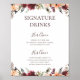 This burgundy orange floral signature drinks sign is perfect for your rustic boho blush, dark green, and gold garden wedding. Design features a wreath or bouquet of minimalist watercolor peach, dusty rose, purple, and light pink florals along with copper, evergreen, yellow, and rust-coloured greenery. The flowers in this design are poppy, rose, and peony. The design is ideal for a simple, elegant spring, summer, or fall country wedding. Please find other matching / coordinating wedding stationery in the rest of this collection.