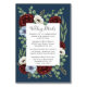 Inform your guests with important information that relates to your big event. You can also add a photo or other information to the back if needed. Design features burgundy red rose peonies, dusty blue and ivory ecru or white anemones add an elegant touch over a greenery floral wreath made up of silver dollar and seeded eucalyptus. The background is a navy blue shade with a white text box. Modern and calligraphy fonts in a dark grey shade are used for a unique look.