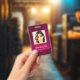 Modern photo business ID identification card with barcode over a burgundy background. Additional information can be added to the backside of this business ID badge