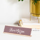Elegant desk nameplate features your name, title, or choice of personalisation in white hand scripted cursive lettering on a burgundy plum purple background.