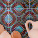 This ceramic tile is a captivating piece of artistry, boasting an intricate and symmetrical design that is reminiscent of blooming flowers or kaleidoscopic imagery. The design is dominated by shapes that resemble petals, rendered in rich hues of burgundy and vibrant red. These shapes are outlined with delicate lines, adding definition and contrast to the design. The spaces between the petal-like shapes are filled with cool, serene blues, offering a visual balance to the warm tones of the shapes. This contrast between warm and cool tones evokes a sense of depth and dimensionality, enhancing the overall visual appeal of the tile. The tile exudes an aura of mystique and enchantment, thanks to the contrasting tones and the complexity of the design. It's a striking piece that would undoubtedly serve as a focal point in any space, adding a touch of elegance and intrigue. Whether viewed up close or from a distance, this ceramic tile is sure to captivate and impress with its intricate design and vibrant colours.