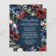 Design features beautiful watercolor floral elements in various shades of red, burgundy, blush pink and more with printed gold coloured geometric flower overlays, greenery. etc. over a navy blue watercolor textured (printed) background.