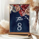 Burgundy Red Roses Floral Navy Blue Wedding Table Number