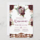 This elegant charro theme quinceanera invitation features moody beautiful dark burgundy roses, with blush pink rose accents, a crest with a beautiful watercolor horse and the welcoming gates to a sprawling ranch. Fully customise all the text to make this your own. See the shop for other versions of this design and matching accessories