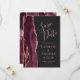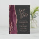 The left-hand edge of this elegant modern wedding save the date card features a burgundy red watercolor agate border trimmed with faux rose gold glitter. The customisable text combines rose pink handwriting, copperplate and italic fonts on an off-black background. The reverse side repeats the burgundy agate design.