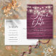 This rustic save the date card features pretty string lights and an elegant script save the date above your details set in elegant typography on a rustic burgundy wood panels background. The reverse has additional save the date details, including your wedding website, with your return address and space for your recipient's address. Designed by Thisisnotme©