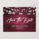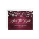 Rustic burgundy wedding save the date postcard featuring a rustic wood background adorned with string lights.
