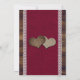 Rustic burgundy and sunflower wedding save the date cards featuring sunflowers and string lights against a barn wood background with burlap and lace. Two burlap hearts at the back.