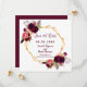 An elegant and romantic wedding Save the Date card. A faux gold coloured geometric shaped frame with Bohemian, boho style watercolored roses, flowers in burgundy and pink. Templates for your names, date and place of the wedding. White background on front. Burgundy letters.