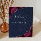 An elegant wedding sign to honour loved ones who have passed. The words "In loving memory" appears in silver grey handwriting calligraphy, with customisable text below, along with a small optional heart silhouette. Burgundy watercolor agate designs trimmed with silver faux glitter frame the message in two corners on a navy blue background. See our collection for matching wedding invitation suite and day-of stationery.