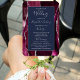 This elegant, modern wedding program fan features a burgundy agate background trimmed with silver faux glitter. The text appears in silver gray handwriting and copperplate fonts on a navy blue rectangle.