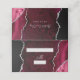 This elegant, modern wedding table reserved seating place card features a burgundy red watercolor agate background trimmed with silver faux glitter. The front of the card provides space for the guest's name and table number in the form of silver gray rectangles. The word "table" appears in silver gray handwriting script. Customize the back of the card with the names of the couple in silver gray handwriting script and the wedding date below in copperplate font.