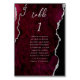 This elegant modern wedding table number card features a burgundy red watercolor agate background trimmed with faux silver glitter. The word "table" appears in silver gray handwriting script. Add the names of your guests who are assigned to each table.