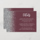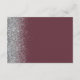 The left-hand edge of this elegant modern wedding details enclosure card features a silver faux glitter design. The customisable text combines pale silver grey handwriting and sans serif fonts on a dark burgundy red background. The reverse side features a matching burgundy and silver glitter design.