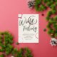 Gold foil wine tasting party invitation in off-white with burgundy wine glass stains and a stylish brush script.
