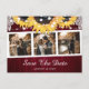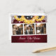Custom burgundy and sunflower wedding photo save the date postcard featuring a photo collage on a rustic wood background with sunflowers, floral lace and string lights.