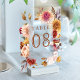 Elegant wedding table number featuring beautiful rustic flowers.