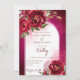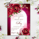 Burgundy wedding maroon flowers modern arch wedding Invitation template instant download. Burgundy background, burgundy flowers, white arch, QR RSVP at the back.