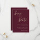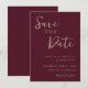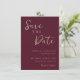 Announce your special day in timeless style with this elegant burgundy save the date wedding card. Featuring a rich burgundy background, romantic script typography, and modern classic layout, this personalised save the date is perfect for couples who want a luxury and sophisticated first impression. Easily customise names, wedding date, and venue details to match your celebration. Ideal for fall weddings, formal ceremonies, classic receptions, vineyard weddings, moody romance themes, and old money inspired events. This beautiful save the date card coordinates perfectly with matching invitations, RSVP cards, menus, seating charts, and wedding suites. Designed to impress guests while keeping your wedding details stylish and memorable. Great for mailing, hand delivery, or keepsake collections. Popular for burgundy and blush weddings, modern luxury décor, and elegant celebrations. Make your announcement unforgettable with a custom save the date card that blends romance, charm, and premium wedding style for your upcoming celebration.