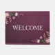 This welcome mat image features a luxurious burgundy background, creating a rich and inviting aesthetic. The pink, lavender and rose gold coloured flowers are artfully arranged in the upper left and lower right corners, creating a balanced visual composition. Centred between the floral arrangements, the word Welcome is in white text in capital letters. The flowers are in a realistic style with gradients of purple to light pink. The welcome mat is an aesthetic modern welcome mat in trendy modern colours. The mat has a sturdy latex action backing that allows for a non-slip grip. The mat is approved for indoors and covered outdoor areas. The welcome mat dimensions are 18" by 24".