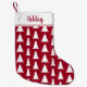 Add a trendy custom double sided holiday stocking to your mantel featuring a modern Christmas pattern of white geometric trees in varying sizes on a burgundy background. Add your name in the sidebar. It will appear in maroon script text over a white strip at the top on each side.