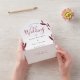 A burgundy and white all-in-one wedding invitation. This invitation is decorated with burgundy and red leaves and mixes a minimalist and dramatic design aesthetic. It includes the invitation as well as a tear-away RSVP card. Simply add your information, add this invite to your cart, and enjoy your beautiful wedding.