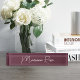 Elegant desk nameplate features your name, title, or choice of personalisation in white hand lettered cursive lettering on a burgundy wine plum background.