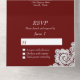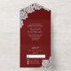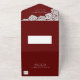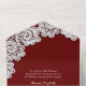 Chic burgundy coloured tri-fold wedding invitation, with lovely graphics of white lace. The custom text is ready to personalise for your wedding day.