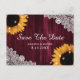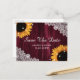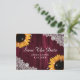 Elegant rustic burgundy and sunflower wedding save the date postcard featuring sunflower flowers and white floral lace on a rustic wood background. Easily personalise this template with your wedding details.