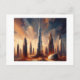 A surreal cityscape features towering skyscrapers with bright, radiant colors, highlighting a futuristic urban scene. The central high-rise dominates the skyline, surrounded by a dramatic sky with a sense of energy and movement.