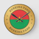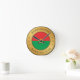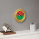 The Burkina Faso flag is inset into a rounded faux gold ring. The words "Burkina Faso" feature at the top and bottom of the design, and are of a pressed effect. The pair of three decorative stars across from each other, are also designed with a pressed effect.