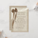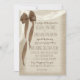 Cascading burlap bow and white lace, rustic country charm wedding invitation in warm brown tones.