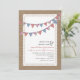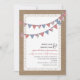 A casual wedding invitation featuring an illustration of bunting that is red gingham, pink floral, and blue over a lace inspired design on front. Background on front and back is burlap inspired. Personalise the text with details of your occasion.