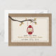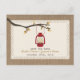 An outdoors fall autumn wedding save the date postcard with a wilderness / camping theme featuring an illustration of a red oil lamp hanging from a tree branch with orange and brown leaves. background is burlap and lace inspired. Personalise the text with your information.