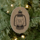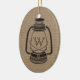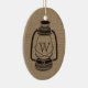 An ornament featuring an all black illustration of a camping style oil lantern over a burlap inspired background. Personalise with your monogram.