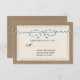 A wedding rsvp featuring an illustration of blue and white striped baking twine at top. Twine is tied in a bow on front. Background is burlap and lace inspired. Look for matching wedding invitations and more at Jill's Paperie.
