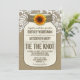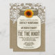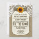 Burlap Lace Mason Jar Wedding Invitations - feature a printed burlap background with a floral lace design printed at the top followed by a mason jar that has the top wrapped in twine (printed design) with a sunflower positioned on the centre. The back of each rustic or country invite features the same burlap and lace wedding invitation design that the front shares. This design can be upgraded to various card stock options found above.